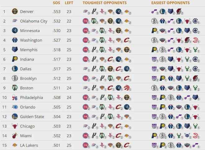 截至今天赛前,雄鹿26胜31负排名东部第11,落后第10的黄蜂1个胜场,落后第9的老鹰1.5个胜场。下面这张图是联盟剩余赛程的难度:掘金、雷霆、森林狼、奇才和灰熊排名前五。雄鹿仅排联盟第22,剩余赛程算是比较轻松的。