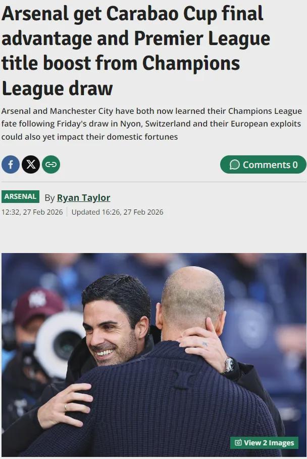 记者RT在伦敦足球发文表示,阿森纳不仅在欧冠抽签中抽到了上上签,他们还在卡拉宝杯决赛以及对曼城的联赛前收获了利好。
