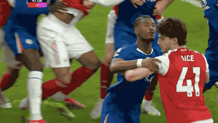 上半场尾声阶段,切尔西开出角球,拉亚被人群挤压,依旧完成了精彩扑救。这一次防守过程中,赖斯抱人+手肘触球,切尔西球员投诉,裁判没有任何表示。